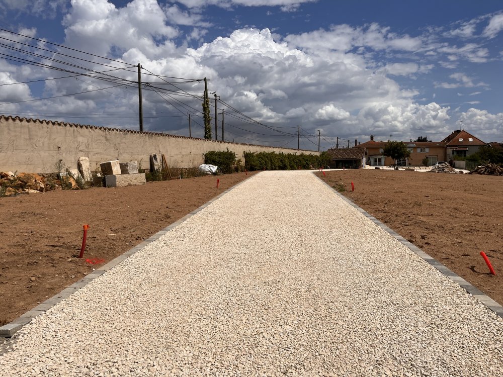 Réfection d'un chemin d’accès en concassé blanc, pose de pavés en délimitation et épaulement des abords en terre végétale.