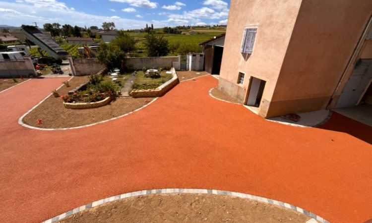 Réfection d'une cour en enrobé coloré, délimitation et création de différents massifs en pavés.