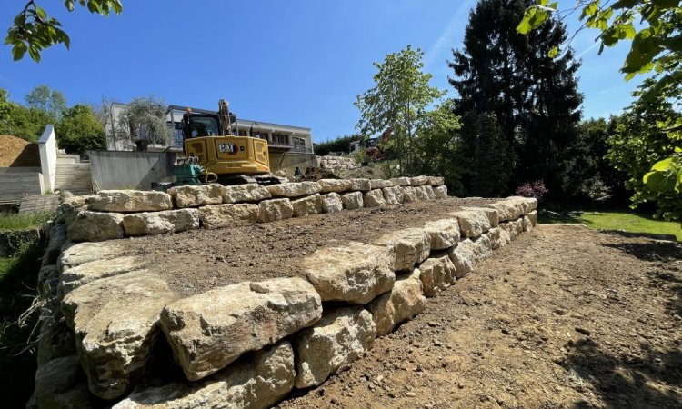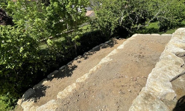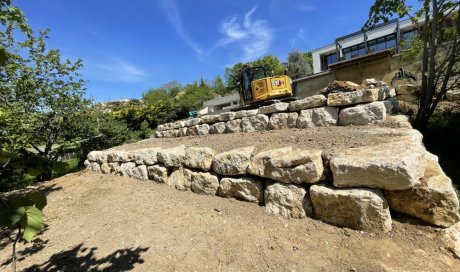 Création de différents paliers en enrochement dans le but pour notre client d'aménager son extérieur en optimisant un maximum de zones plates malgré son terrain pentu.