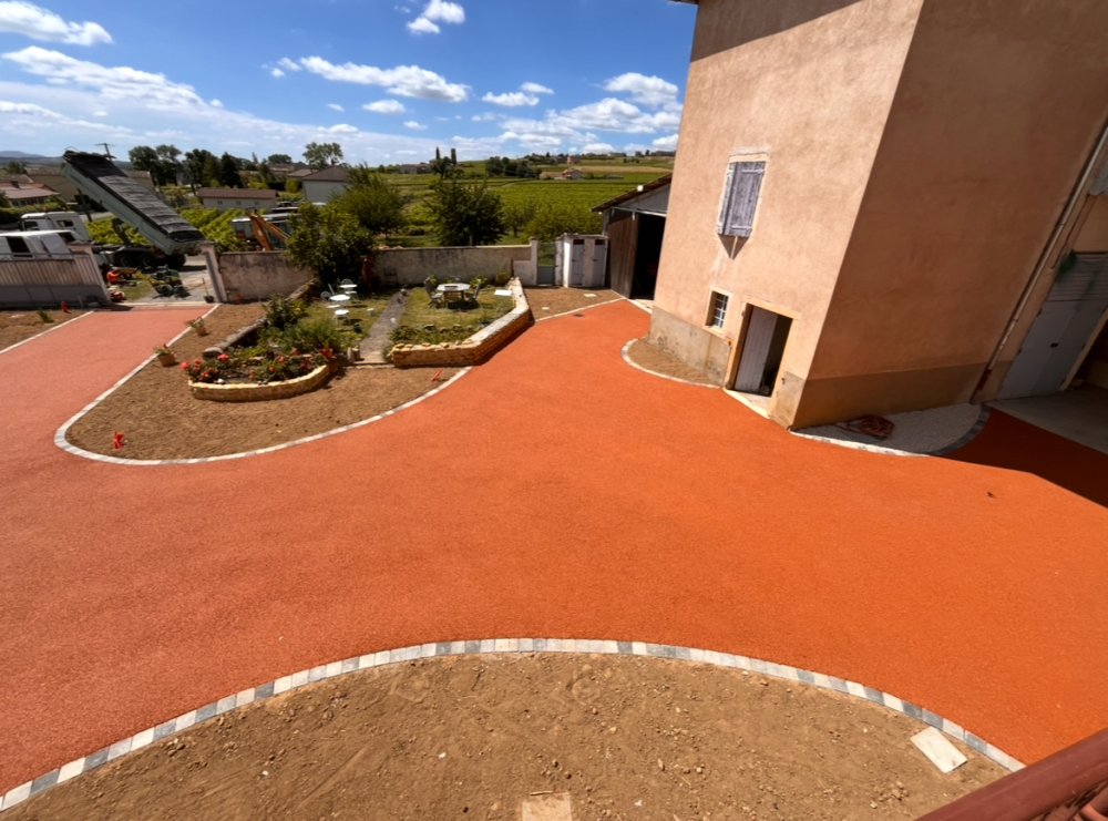 Réfection d'une cour en enrobé coloré, délimitation et création de différents massifs en pavés.